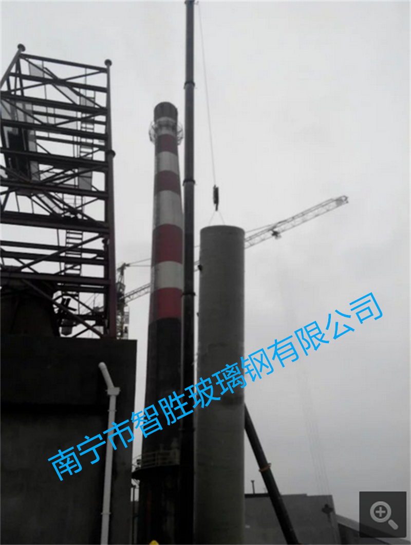 主要用于排放煙氣高度為100m-200m的混凝土煙囪的內筒。在此構造中,充分利用了玻璃鋼的耐高溫、耐腐蝕的特點,混凝土煙囪提供支撐,有的是一個混凝土煙囪套1個玻璃鋼內筒,也有的套2個或3個玻璃鋼內筒,具體根據業主的設計和要求來定。