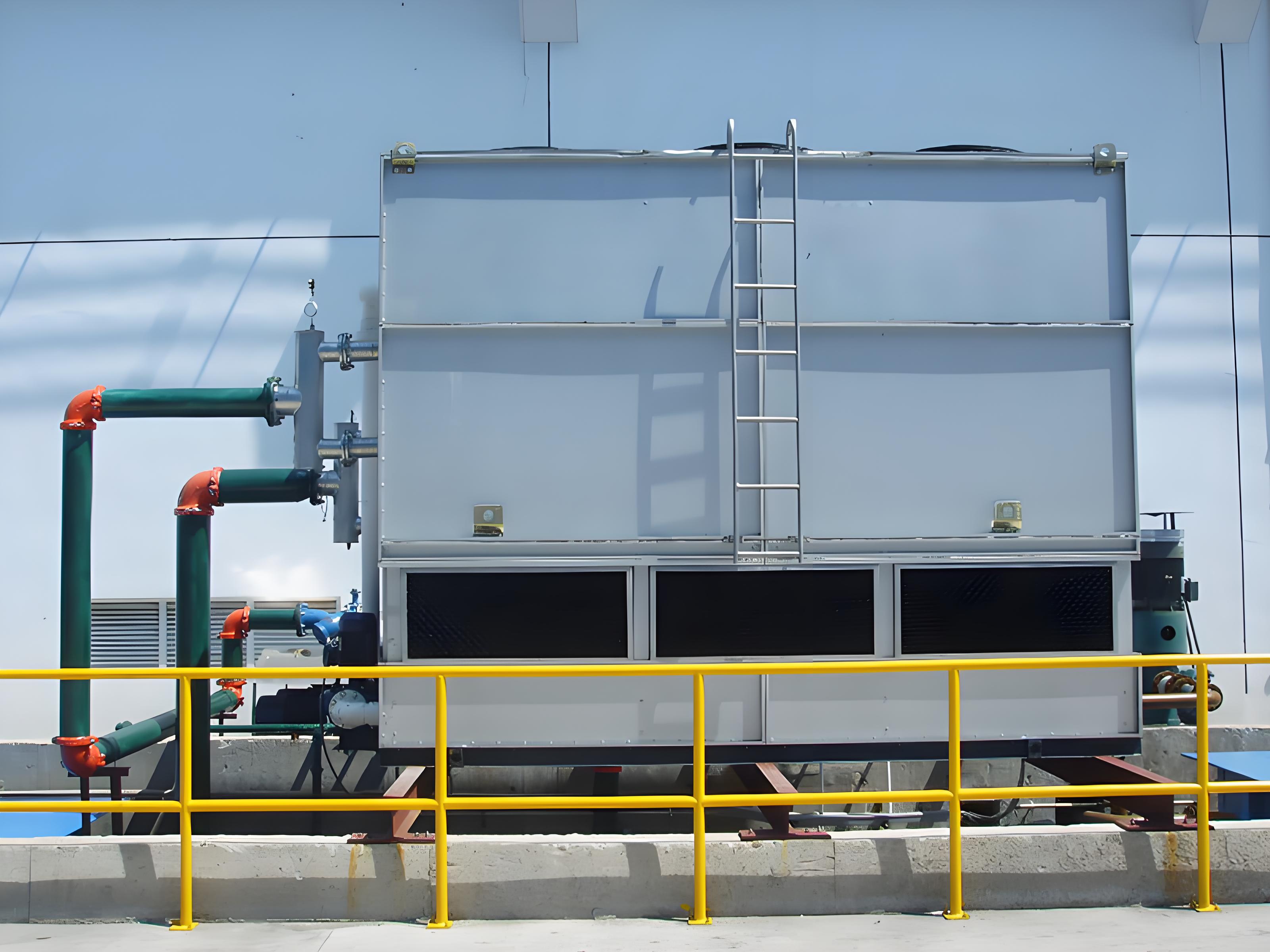 工作過程 閉式冷卻塔通過“間接換熱”實現(xiàn)冷卻,核心流程分為內部循環(huán)(工藝介質)和外部循環(huán)(噴淋水+空氣)兩部分: 流程:高溫冷卻介質(如水、油或乙二醇溶液)從生產(chǎn)設備(如高爐、軋機)流出,進入閉式冷卻塔的盤管。 換熱:熱量通過盤管壁傳遞給外部噴淋水,降溫后的介質返回生產(chǎn)設備循環(huán)使用。 優(yōu)勢:介質與外界隔離,避免污染、結垢和蒸發(fā)損耗。 噴淋水循環(huán):噴淋水泵將水均勻噴灑在盤管表面,吸收內部介質的熱量。 空氣強制對流:風機驅動空氣流經(jīng)盤管和噴淋水,通過蒸發(fā)散熱和顯熱交換降低水溫。 水回收利用:噴淋水經(jīng)冷卻后落入底部水箱,循環(huán)使用,少量蒸發(fā)損失通過補水系統(tǒng)補充。 溫控調節(jié):根據(jù)工藝需求自動調節(jié)風機轉速或噴淋水量,優(yōu)化能耗。 冬季防凍:寒冷地區(qū)可加裝電伴熱或乙二醇溶液,防止盤管凍結。1. 內部循環(huán)(閉式回路)